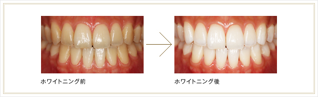 ホワイトニングとは、歯磨きでは落とせない歯の黄ばみなどの着色を、専用の薬品を使用して歯を白くする方法です。 歯を削ったりすることなく、歯の中にある色素を分解することで、歯の明度を上げて白くしていきます。専用薬剤で歯の色素を分解して歯の漂白をします。 施術中、施術後に歯がしみることが生じる場合がありますが、しばらくすると落ち着いてくることがほとんどです。オフィスタイプのほうが症状が一般的に症状が出やすいと言われています。 また施術後時間が立つとリバウンド(後戻り)が見られることがあります。 費用についてはこちら