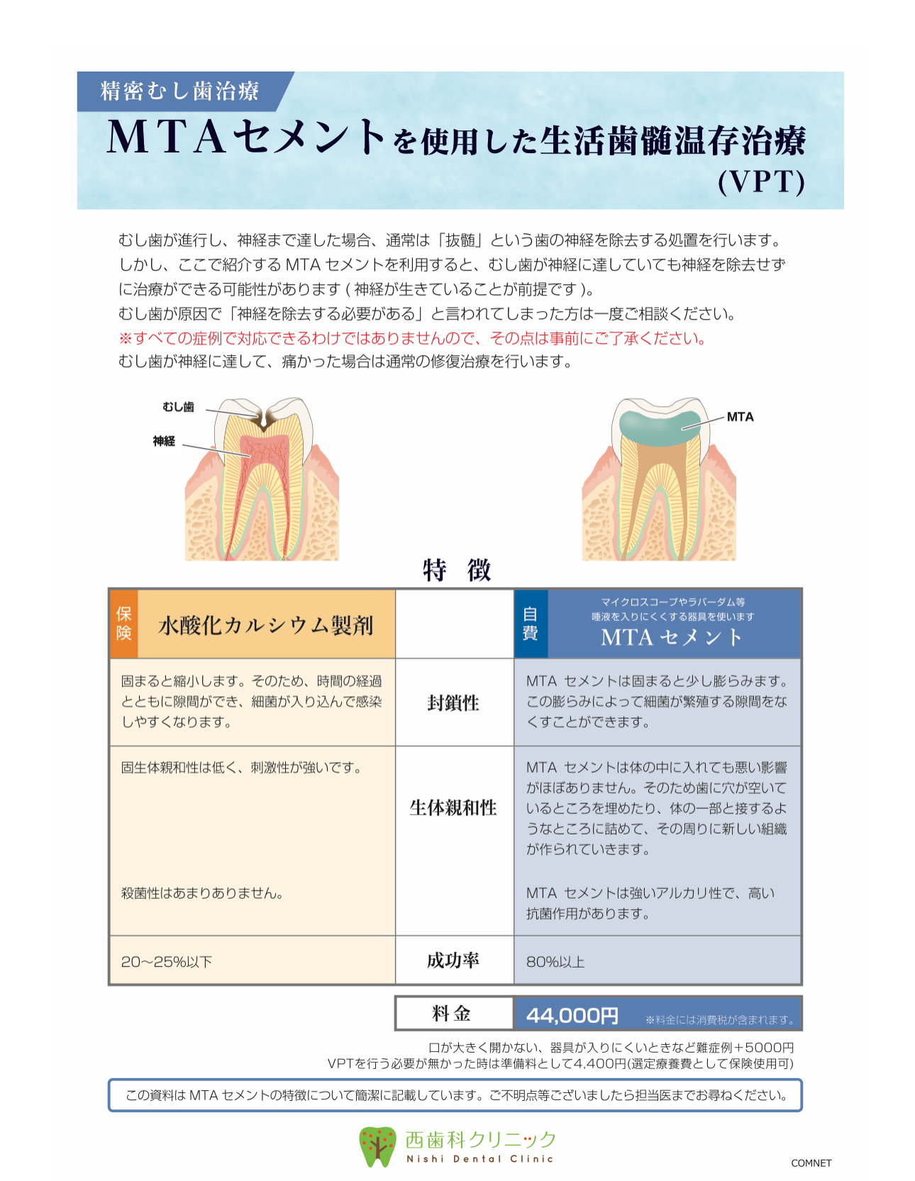歯の神経を除去するとその歯は神経がないため寿命が短くなります。これを回避するするためにMTAセメントを使用し、極力、神経を除去せず保護することが可能になります。
